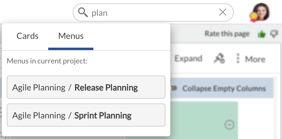• Within the Project: When searching within a project, the system only looks for menus specific to that project. The keyword must match the menu name to appear in the Menus tab. Clicking a menu result takes the user directly to that menu.