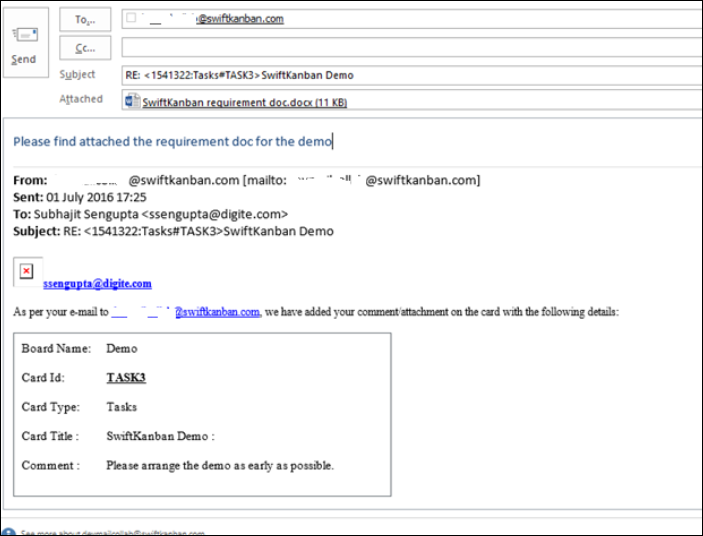 Once a card has been added to a Kanban board, users can interact with each other using the Comments feature of the card. These comments can be directly added within SwiftKanban (if users have access to SwiftKanban), or can be added via email.