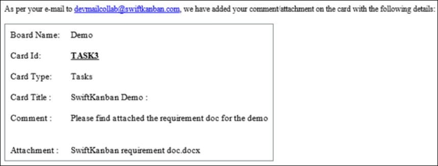 To add comments on the card via email, you must have the system acknowledgment email that was sent after card creation. You will receive this acknowledgment email if you are a card creator, card owner, or board manager for the card. You as well as your Board Manager can reply to the email to add comments in the card. To add a new comment, simply reply to the acknowledgment e-mail without changing the subject as shown in the e-mail below: