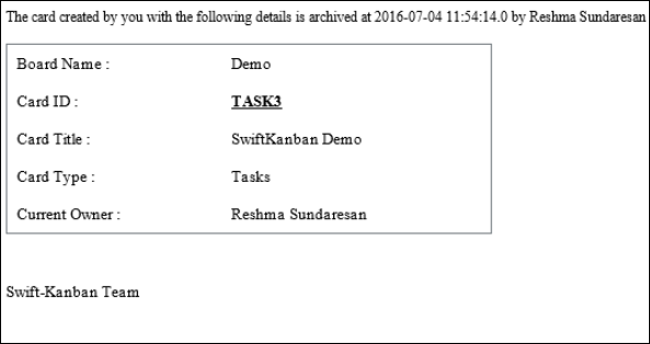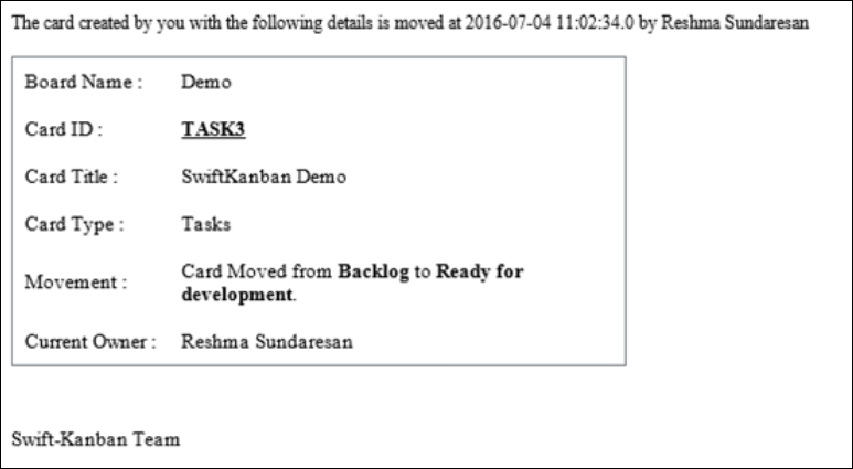 Any card movement across the board triggers an e-mail to you as the creator of the card to keep you updated on the card status. For example, if the card is moved from Backlog to the Board, you will receive an e-mail as shown below.